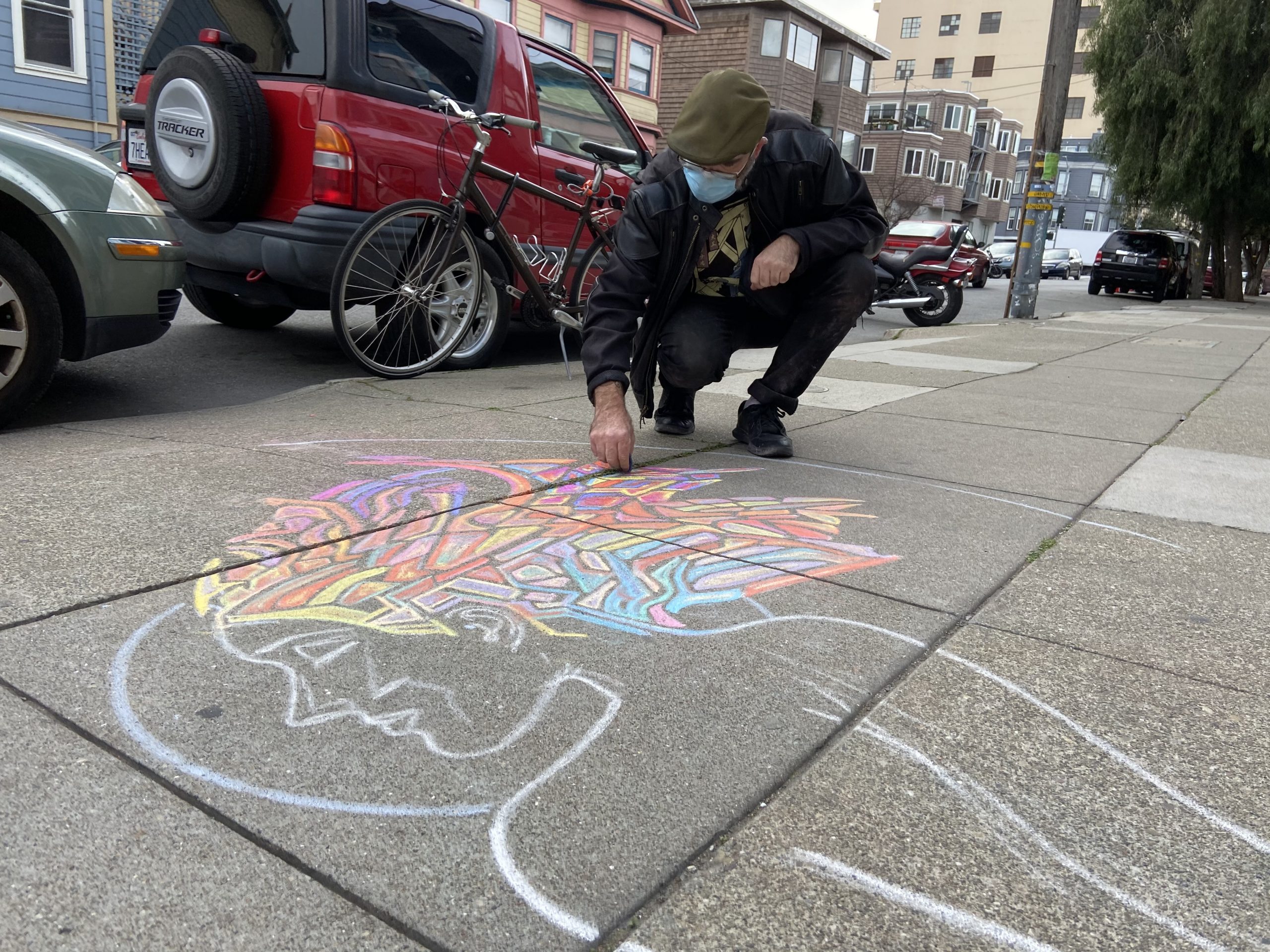 Larson, who is 43, lives in the Mission and comes out to draw on the sidewalk to keep his sanity during the pandemic, which has “been pretty tough on mental health.”