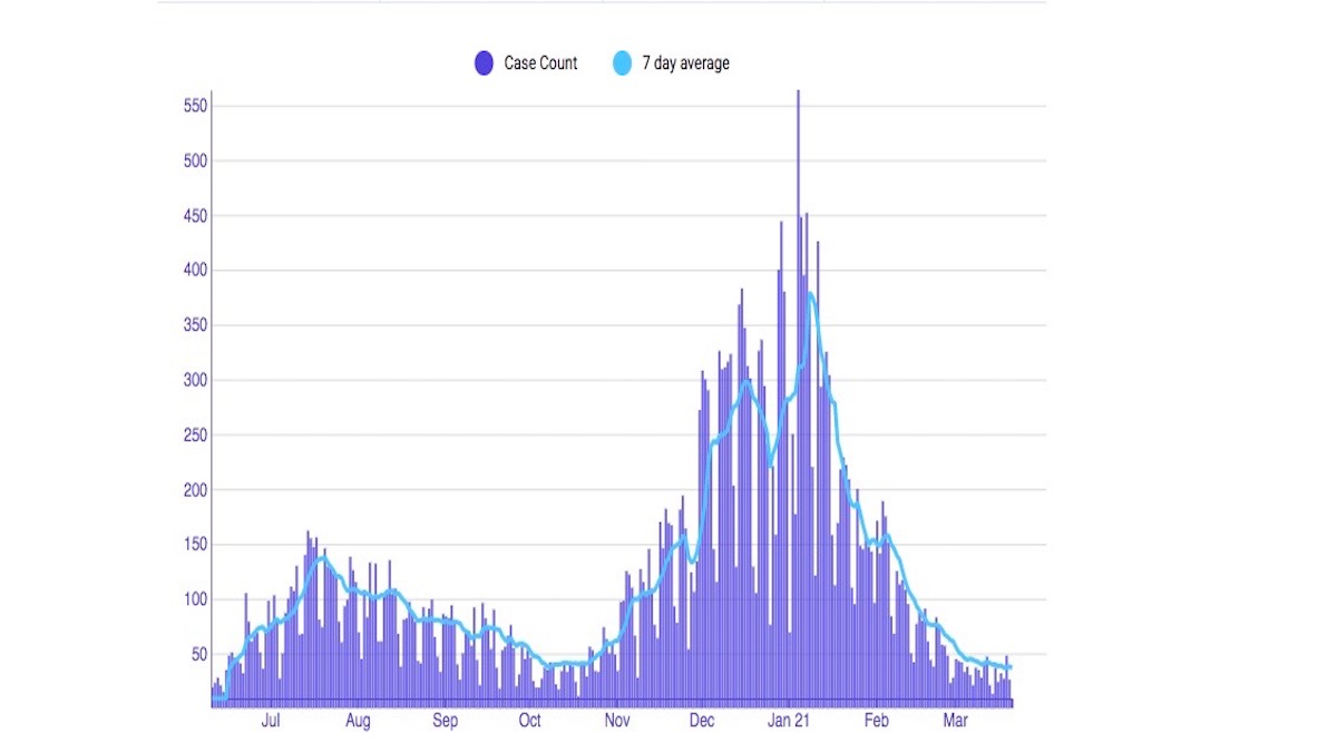 For the week ending March 16, the seven-day rolling average of daily new cases in the City wasĀ 30 or 3.4 new cases per day per 100,000 residents.