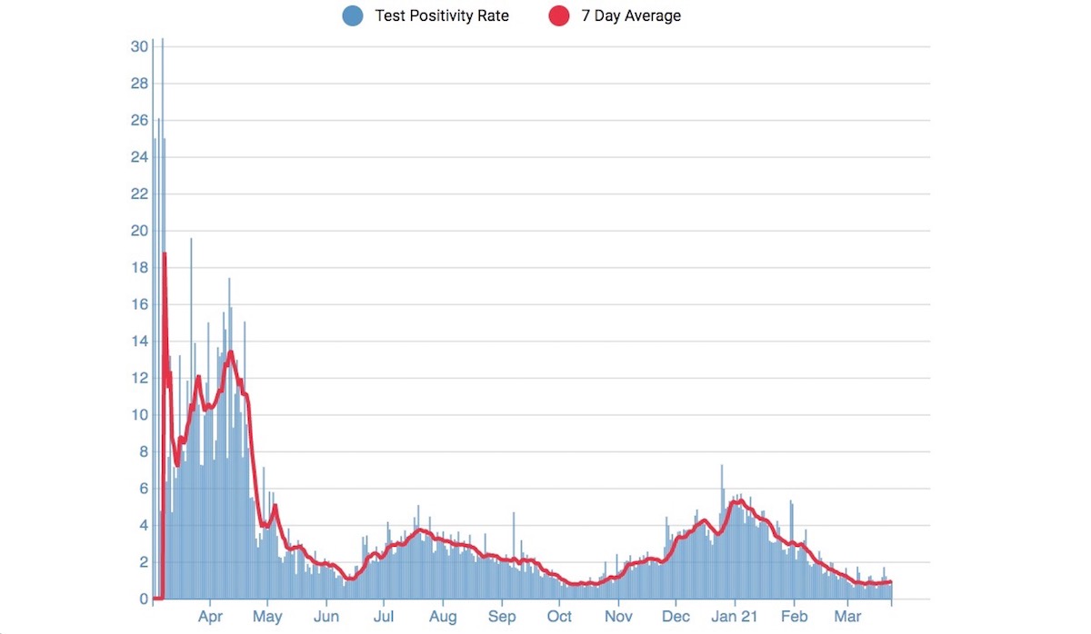 For the week ending March 19, the seven-day rolling average of daily new cases in the City remained atĀ 29 or 3.3 new cases per day per 100,000 residents.Ā