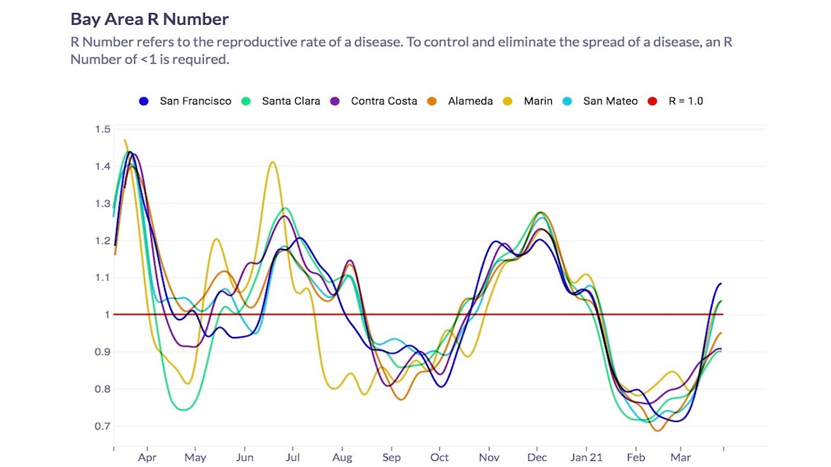If the R Number is any indicator, buckle up, we’reĀ headed back to Surge City.Ā Covid-19 R Estimation puts the San Francisco R Number atĀ 1.06, over 1 for the first time since January 8. The ensemble brings together models which estimate San Francisco’s R Number anywhere from .63 to 1.11 for an average of Ā .8.Ā Most models agree that California’s R Number remains a bit aboveĀ .8 (except for one which estimates it at .51).Ā