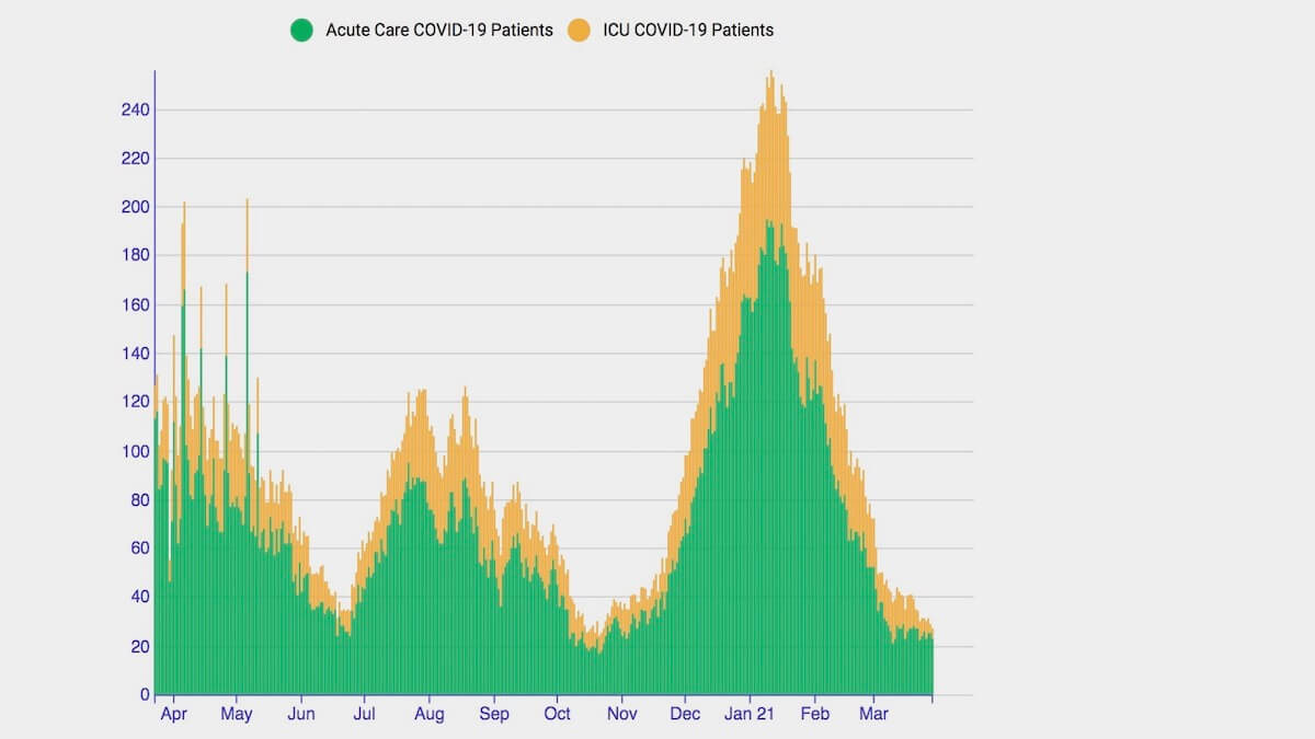Covid hospitalizations have reached the October low point, and ICU levels are the lowest since the pandemic began.Ā  For the week ending March 29, the rate of weekly change in Covid positive patients fell 19 percent.Ā  Ā During that week,Ā  the seven-day average availability of ICU beds was 33 percent and Acute Care availability was 24 percent. On March 29, DPH reports 96 ICU beds were available and 389 Acute Care beds. In case of a surge 298 ICU beds were available on March 29 and 227 Acute Care beds.