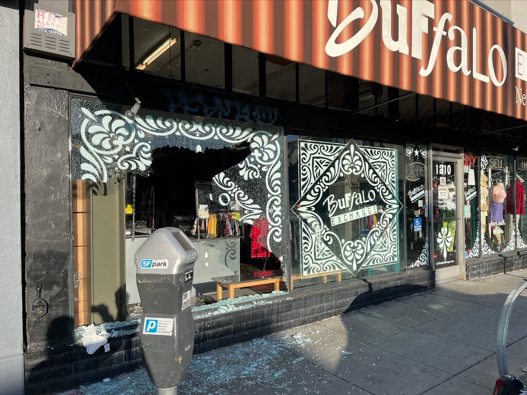 A Mission resident on his morning dog walk today ran across this scene at Buffalo Exchange at 1210 Valencia St. We are following up and will update. If you are the owner, please get in touch at info@missionlocal.com