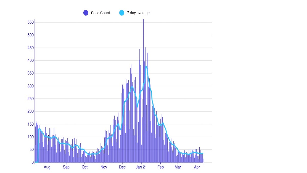 For the week ending April 8, the seven-day rolling average of daily new cases in the City dropped to 33 or 3.8 new cases per day per 100,000 residents.