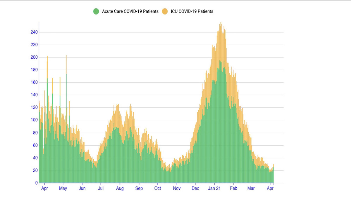 The recent rise has come in Acute Care. For the week ending April 6, the rate of weekly change in Covid positive patients fell 4 percent.Ā Ā During that week,Ā the seven-day average availability of ICU beds was 35 percent and Acute Care availability was 25 percent. On April 6, Covid patients made up 2.5 percent of available ICU and 1.7 percent of Acute Care beds. Ā Surge capacity is reported to be at 100 percent for both ICU andĀ Acute Care.Ā