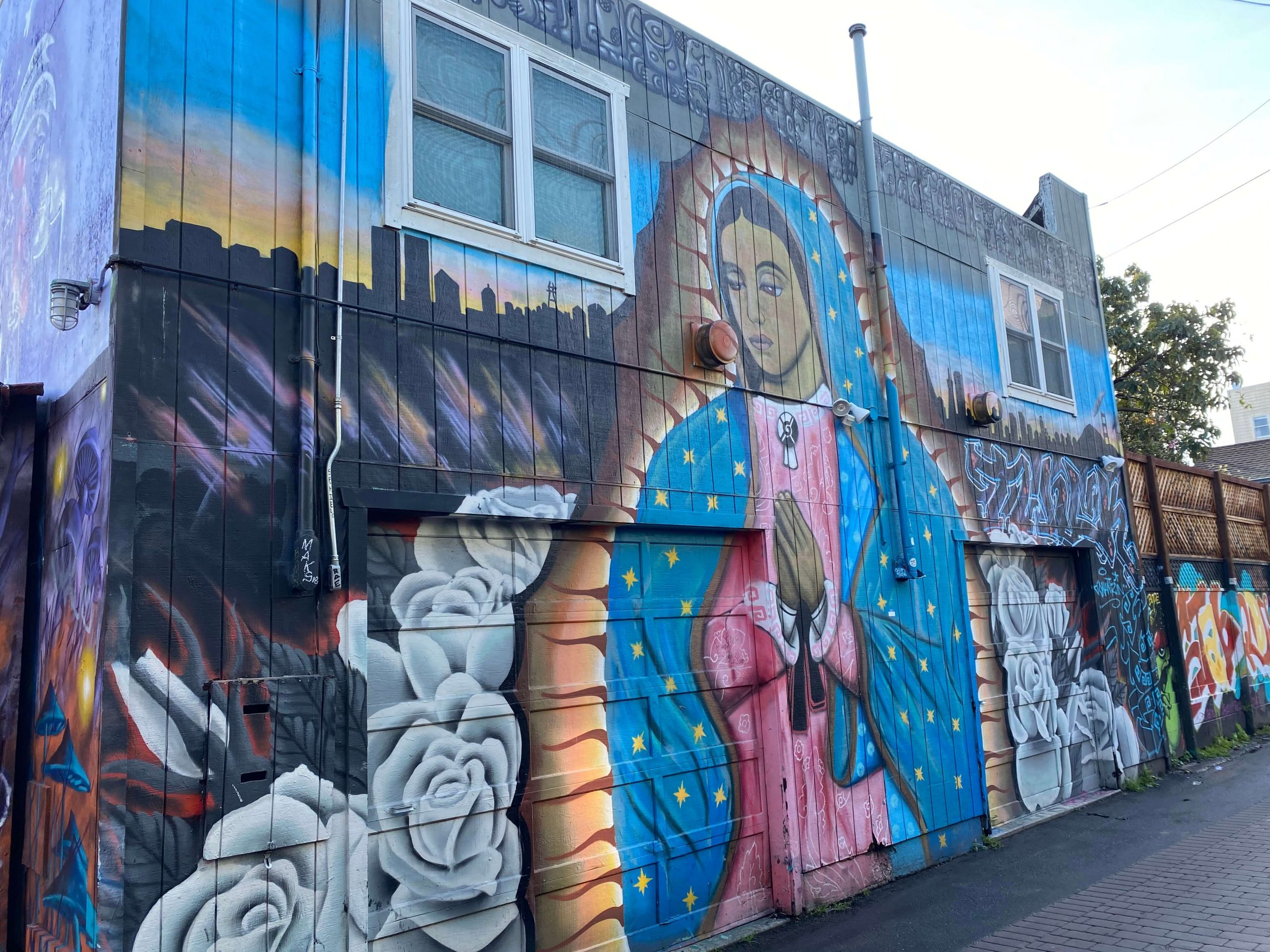 The colorful mural features the Virgin of Guadalupe in pink and blue, flanked by flowers and a cityscape. It has become a neighborhood landmark in the years since it was painted.