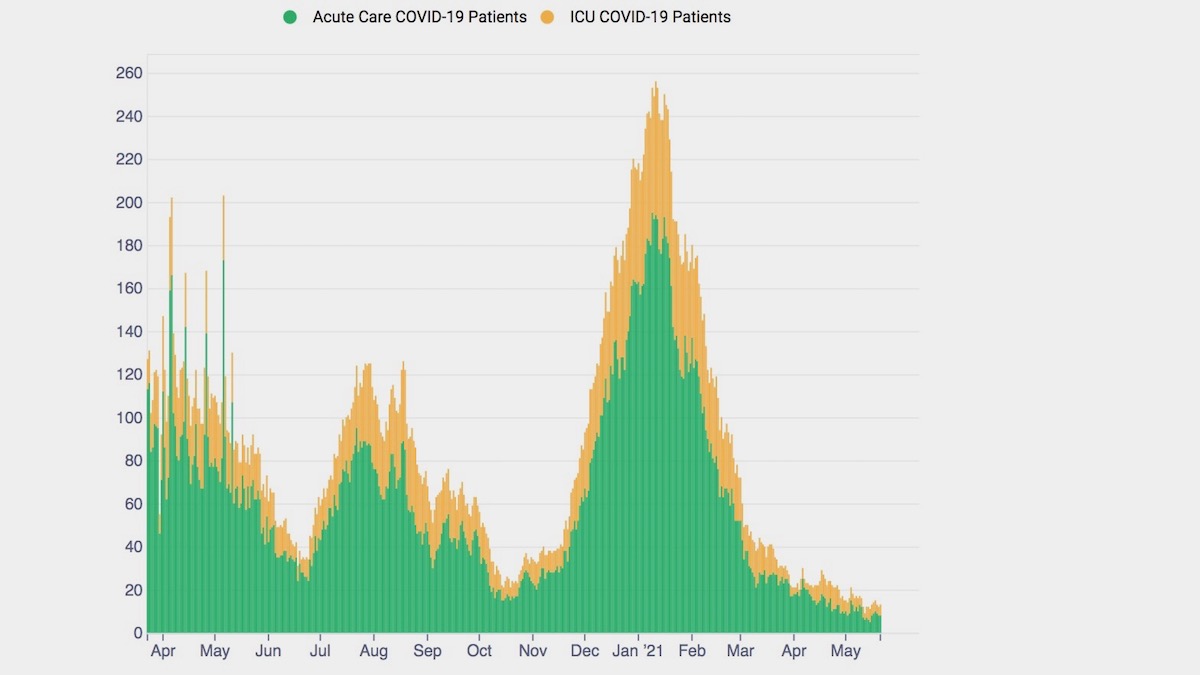 For the week ending May 21, though the raw numbers stay low and stable, the rate of weekly change in Covid positive patients rose Ā 15Ā percent, . During that week,Ā the seven-day average availability of ICU beds wasĀ 34 percentĀ and Acute Care availability wasĀ 26 percent. On May 18, DPH reports Covid patients comprisedĀ 2.1 percentĀ of ICU occupancy andĀ .8 percentĀ of Acute Care occupancy and the City hadĀ 100 percentĀ ICU andĀ 100 percentĀ Acute Care surge capacity.