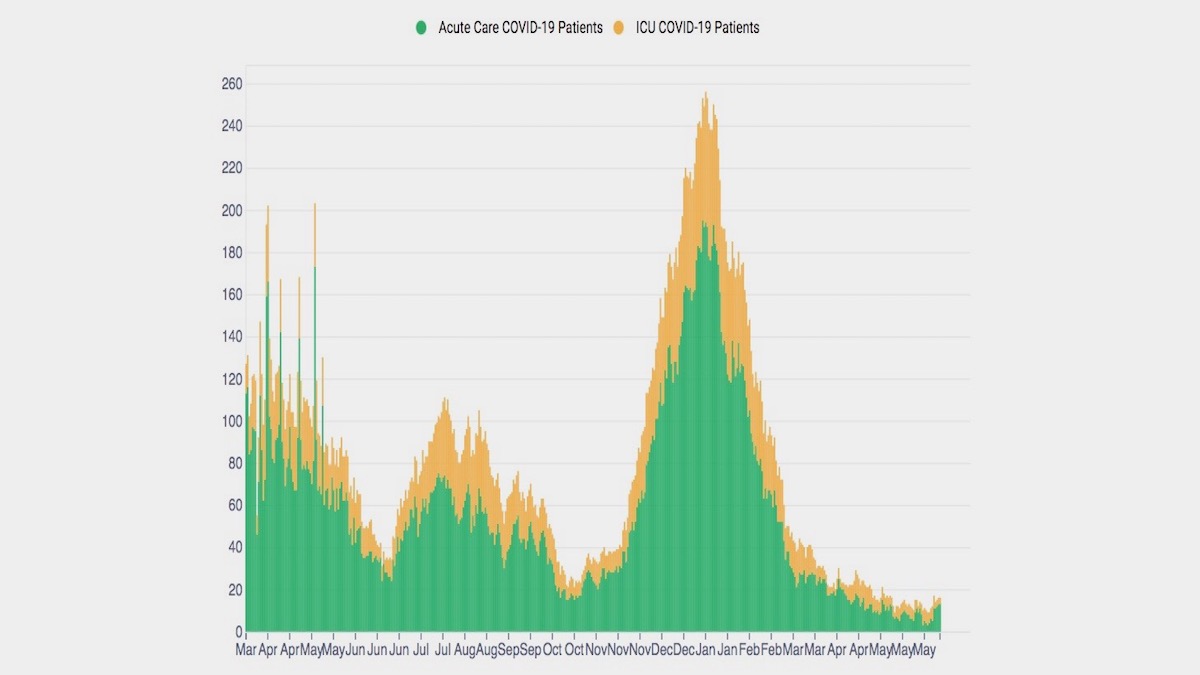 With relatvely low raw numbers, high percentage increases can be misleading. For the week ending June 10, DPH reports the rate of weekly change in Covid positive patients rose 68 percent from 9 on June 3 to 16 on June 10. During the week of June 10, the seven-day average availability of ICU beds was 37 percent and Acute Care availability was 25 percent. On June 10, Covid patients accounted for 1.75 percent of ICU occupancy and .98 percent of Acute Care occupancy, and DPH reports 100 percent ICU and 98 percent Acute Care available for a potential surge.