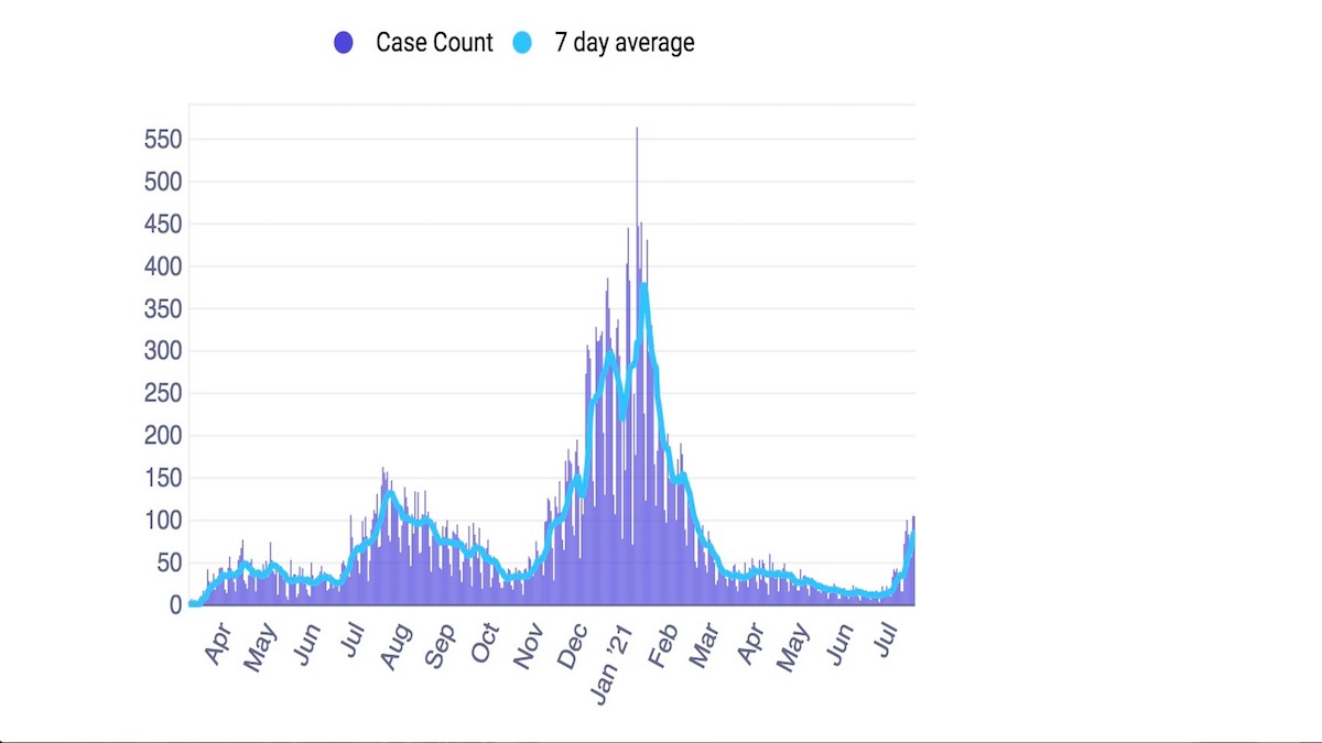 For the week ending July 11, the seven-day rolling average of daily new cases in the City was 68 new cases, or 7.8 new cases per day per 100,000 residents.