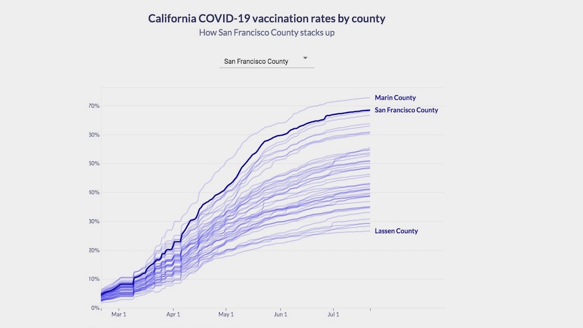 The CDC data used for the chart lags behind the data supplied from SFDPH. As of July 22, DPH reports overĀ 75 percentĀ (659,088) of all San Francisco residents have received one dose, and over 69 percentĀ (602,092) are completely vaccinated.Ā On July 22, the seven-day rolling average of shots per day was onlyĀ 462.For information on where to get vaccinated in and around the Mission, visit ourĀ Vaccination Page.