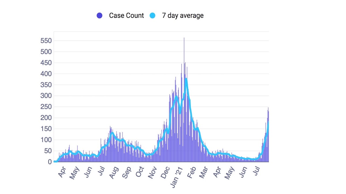 Vaccination rates seem to make little difference in neighborhood case counts. Between May 24 and July 23, DPH recorded 234 new cases among Mission residents (76 percent vaccinated), or 40 new cases per 10,000 residents. The only other SF neighborhood reporting in excess of 200 cases was Bayview Hunters Point with 314 new cases for a rate of 83 new cases per 10,000 residents. Remember, Bayview Hunters Point has one of the highest vaccination rates in the City (82 percent). Lakeshore, the least vaccinated neighborhood (41 percent), had 39 new cases and a new case rate of 26 new cases per 10,000 residents.