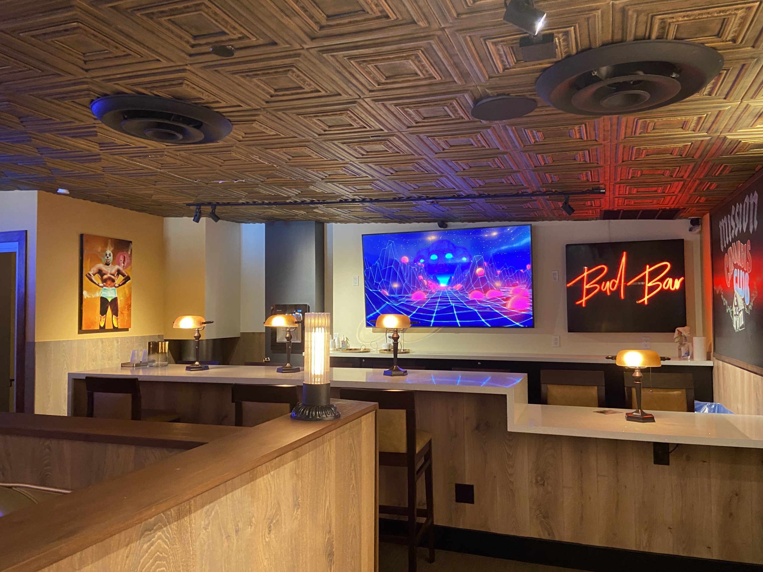 With a maximum capacity of 58 people, there are numerous booths, including a large one that fans out and takes center stage. A bar is prepped with stools and a water filler station. As one client wandered in excitedly, a Cannabis Club employee fetched her a glass.