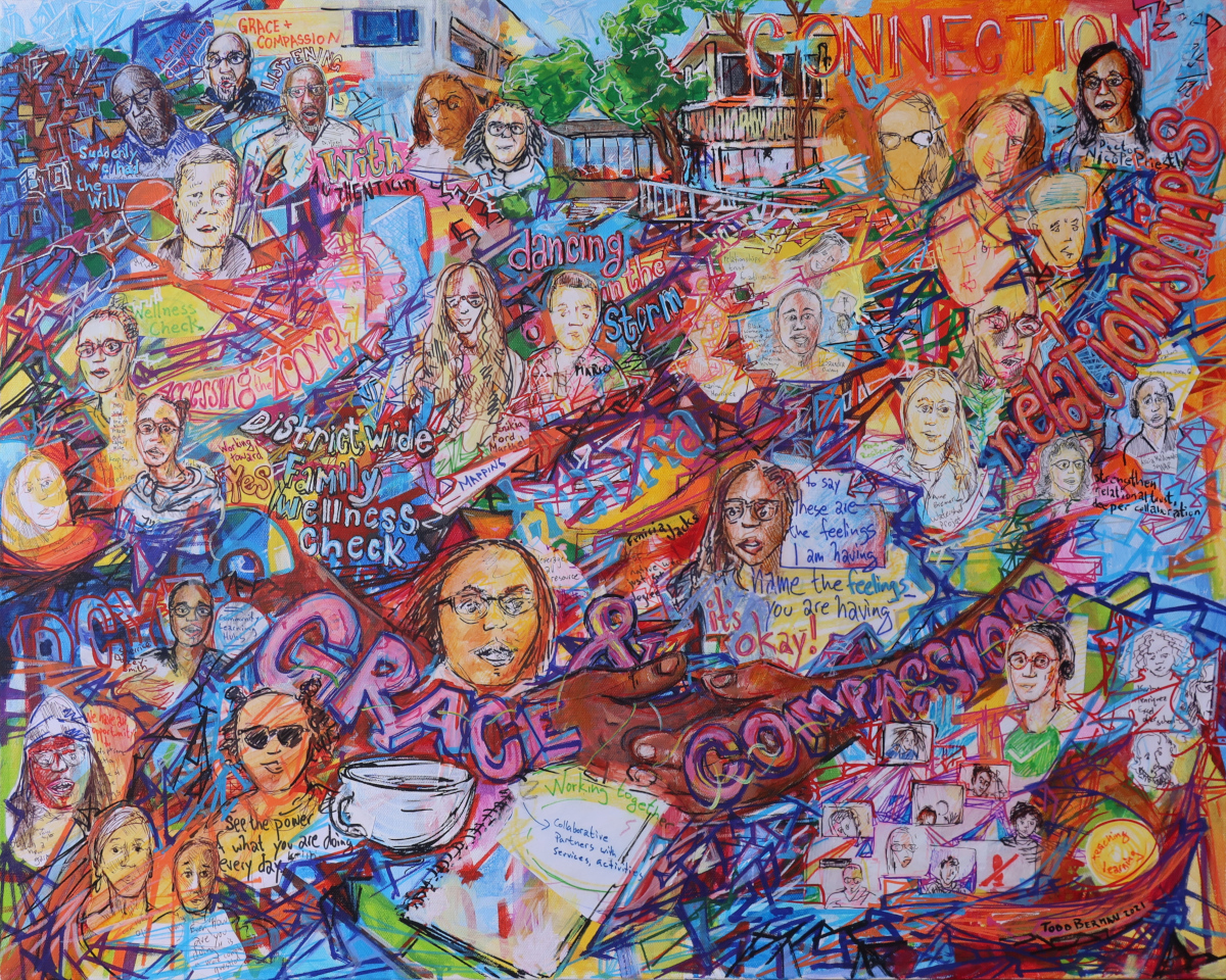 When I am in meetings, I take sketchnotes to stay focused and process what I am learning. I have combined these sketchnotes into a painting to show how SFUSD worked through a pandemic.