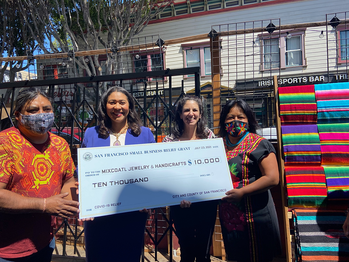 In front of Rivera’s colorful store, a family-run gift shop on 24th Street, Mayor London Breed joined Supervisor Hilary Ronen, and Kate Sofis, the director of the Office of Economic and Workforce Development to distribute four $10,000 checks, one to Mixcotl and the others to four other small Mission businesses.