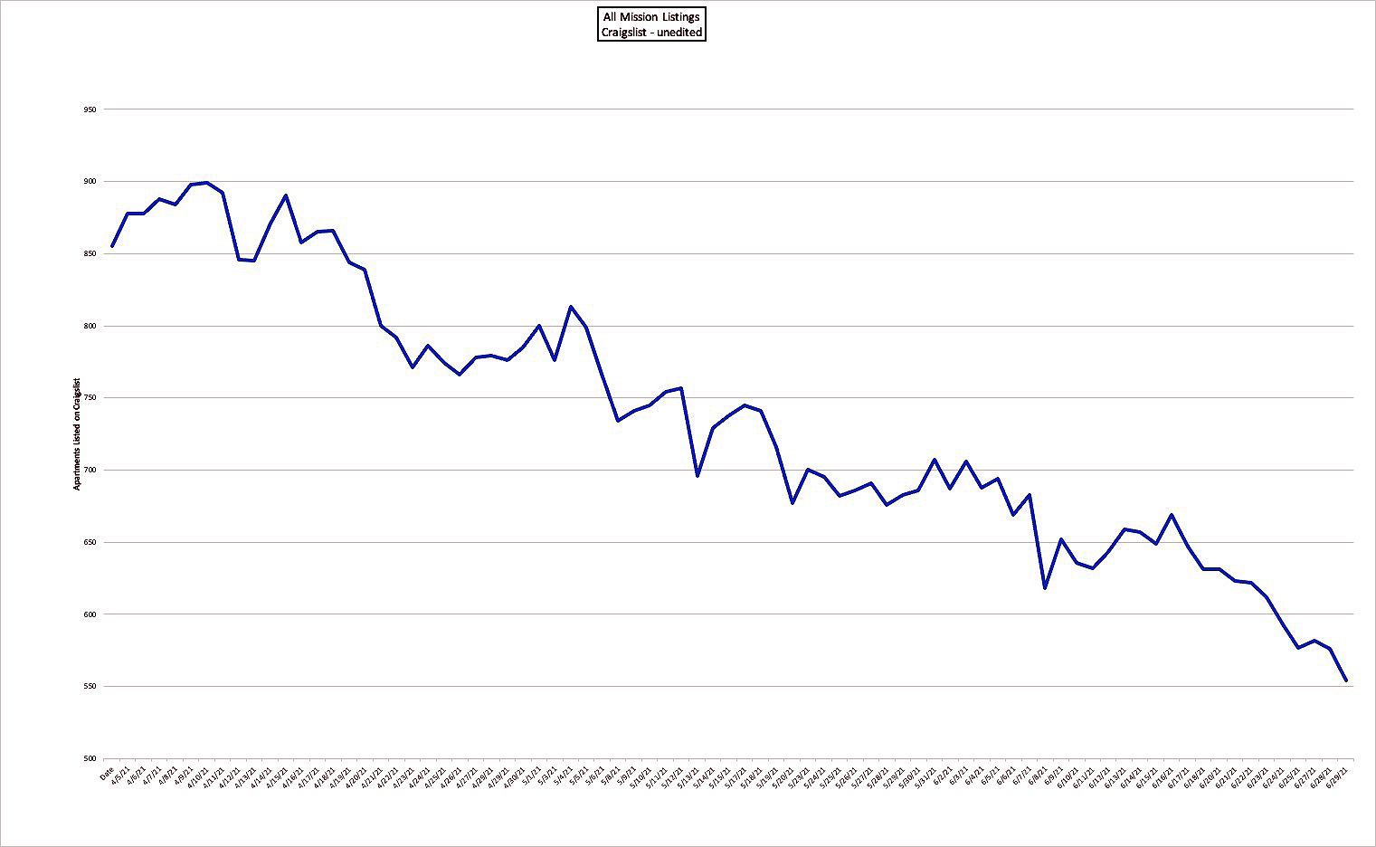 We waited and watched the listings. I noticed that some apartments were listed multiple times, just days apart. I decided to not edit the Craigslist totals, just just wrote down whatever the top of the page said. The availability began to turn toward fewer listings in late April. That trend continues through today, with total Mission District availability now around 550 listings.