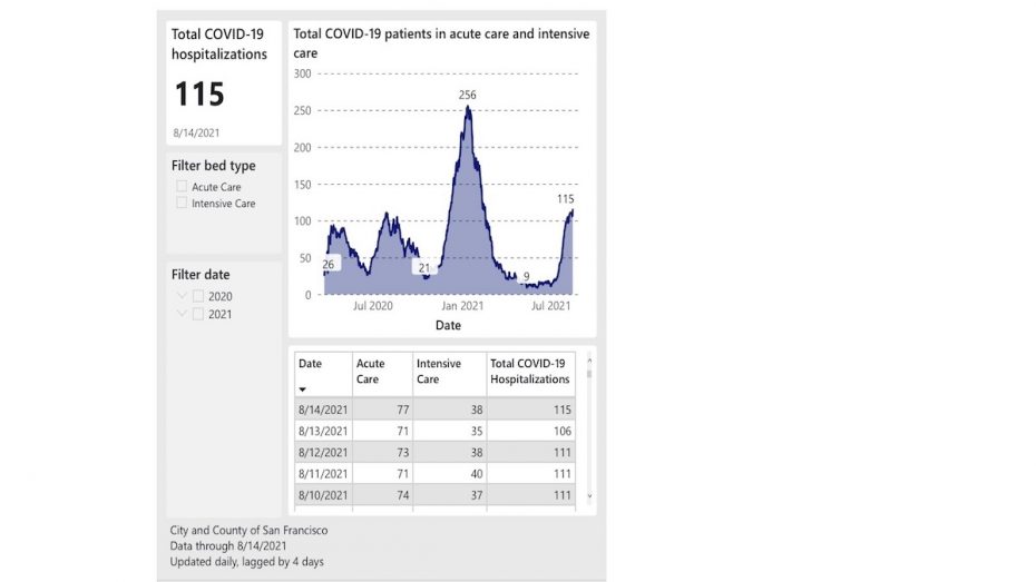 The latest report from the federal Department of Health and Human Services shows SFGH withĀ 17Ā covid patients andĀ 76 percentĀ ICU occupancy, while across the Mission, CPMC hadĀ 14Ā covid patients andĀ 71 percentĀ ICU occupancy. OfĀ 110Ā reported covid patients,Ā 55Ā were at either SFGH or UCSF.
