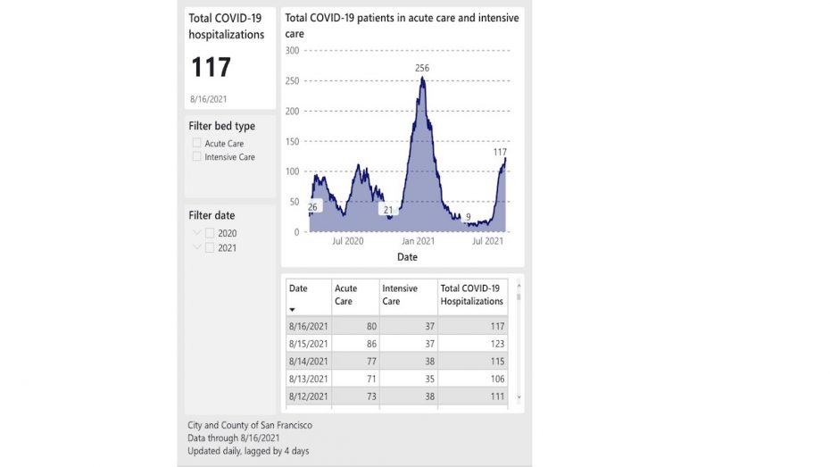 The latest report from the federal Department of Health and Human Services shows SFGH with 17 Covid patients and 76 percent ICU occupancy, while across the Mission, CPMC had 14 Covid patients and 71 percent ICU occupancy. Of 110 reported Covid patients, 55 were at either SFGH or UCSF.