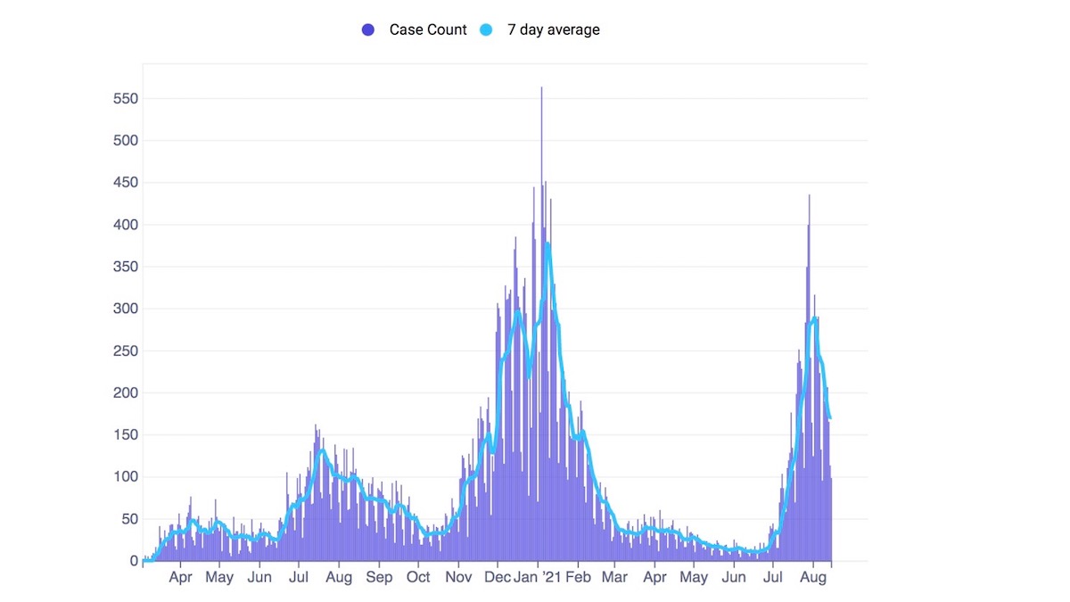 For the week ending August 12, the seven-day rolling average of daily new cases in the City was 181 new cases, or approximately 20.2 new cases per day per 100,000 residents (based on 896,000 population).