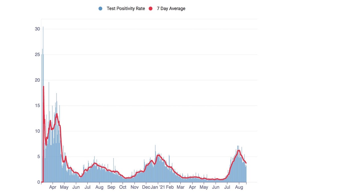 For the week ending Aug. 15, the seven-day rolling average of daily new cases in the city was 170 new cases, or approximatelyĀ 19 new cases per day per 100,000 residents (based on 896,000 population).