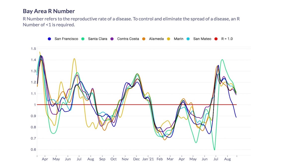 The virus remains, as it has now for at least a week, on a high plateau in San Francisco. Most encouraging are the R Number models which estimate the transmissiblity of the virus well below 1.
