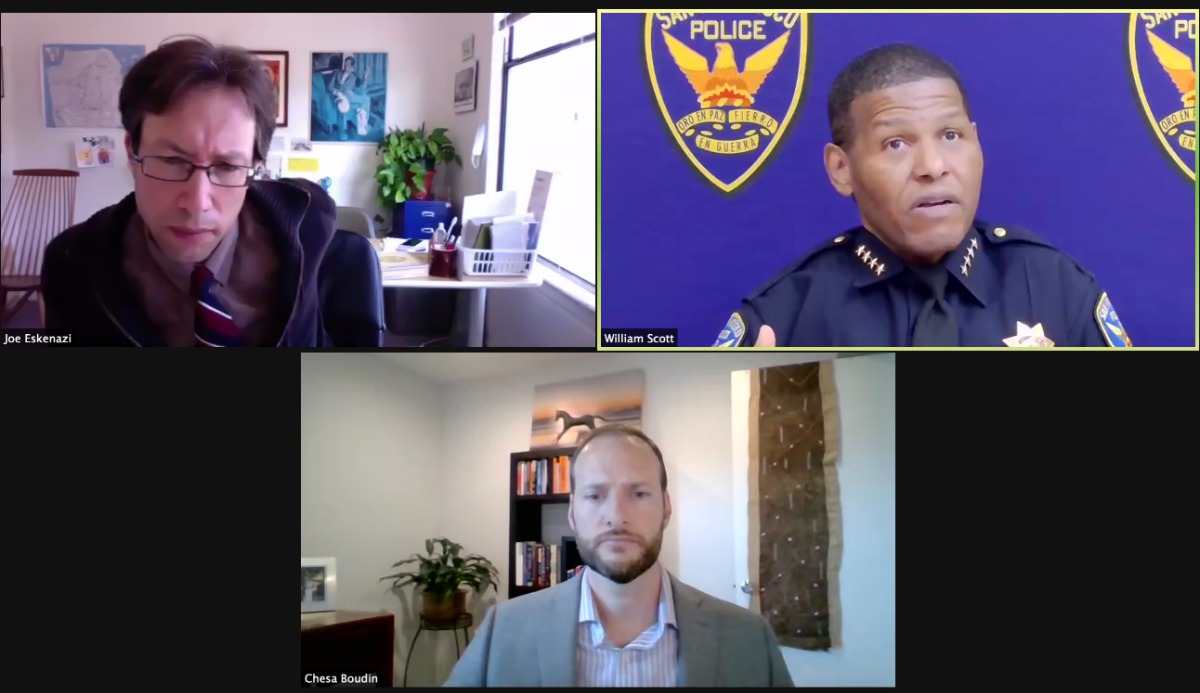 San Francisco Police Chief Bill Scott and District Attorney Chesa Boudin presented a united front in addressing perceptions of high crime and lowered public safety in San Francisco during a Monday evening panel conversation moderated by Mission Local’s Joe Eskenazi.