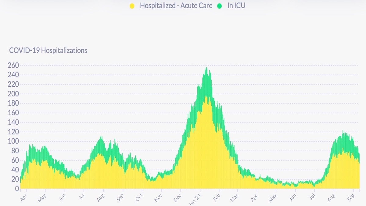 Our hospital graph has been slow to update. On Sept. 11, DPH reports there were 74 hospitalizations. or about 8.5 per 100,000 (based on an 874,000 population). There were 55Ā in acute care, 19 in the ICU. The latest update from DPH says, as of Sept. 3, 76 fully vaccinated San Franciscans had been hospitalized (a rate of 14.3 per 1,000 cases compared to 84.8 per 1,000 cases for those not fully vaccinated) . According to the CDC, there were 53 new admissions for the week ending Sept. 12Ā (no change from the previous week). For the week ending Sept. 12, covid patients accounted for 4.41 percent of hospital beds (-.82 percent from previous week) and 8.43 percent of ICU beds (-3.06 percent from previous week). As of Sept. 7, the CDC says that, of more than 176 million vaccinated U.S. residents, 14,115 patients with a covid vaccine breakthrough infection were hospitalized or died. Of that number, 25 percent either had no covid symptoms or their hospitalization or death was not covid-related.
