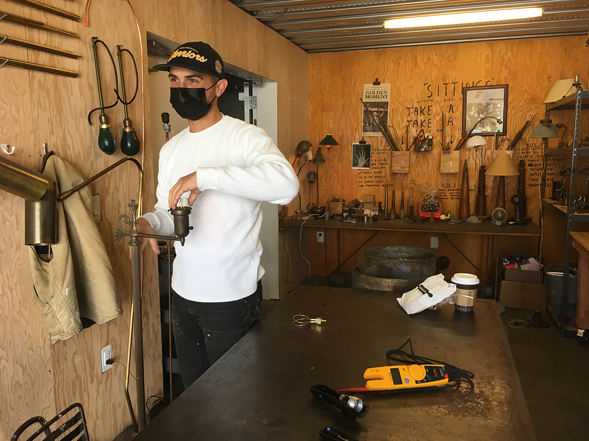 He built his first lamp in 2008, not long after a brief run at Chico State left him certain only that he was not destined for college in the near future. “After that I just said ‘yes’ and tried a million things,” he said, including landscaping, barista-ing, customer service at American Apparel, and photo assisting. Finally, his love of wiring lamps led to an apprenticeship as an electrician and eventually the union gig.