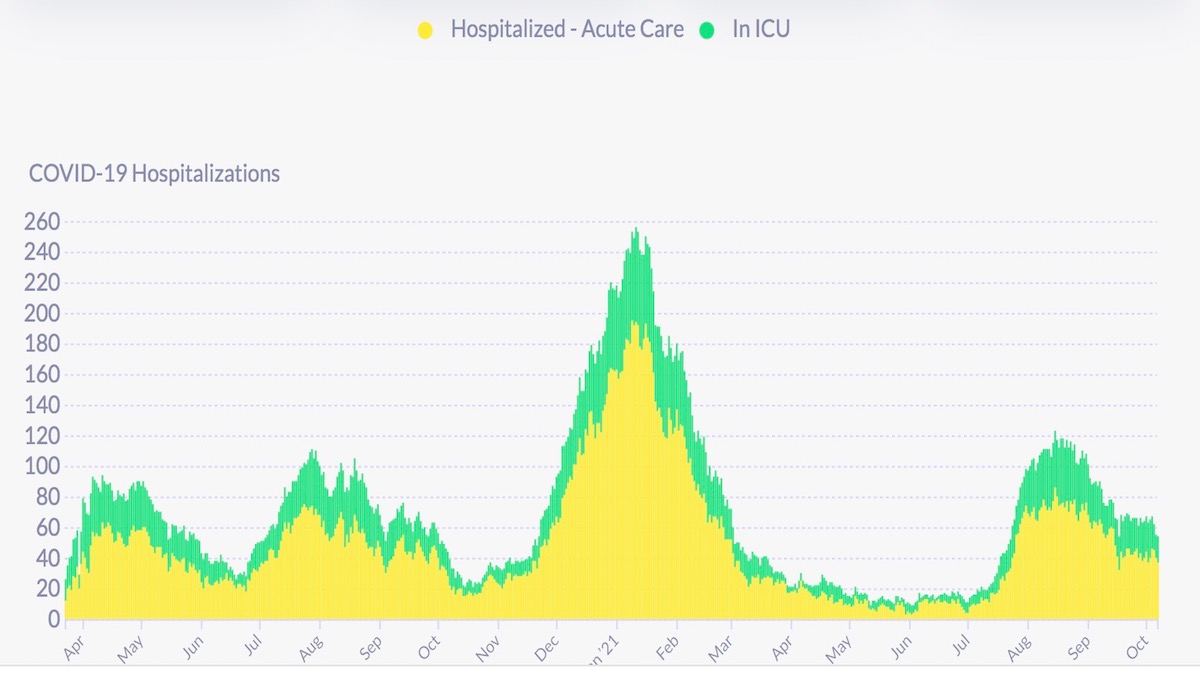 On Oct. 7, DPH reports there were 54 covid hospitalizations,Ā or aboutĀ 6.2 per 100,000 (based on an 874,000 population).Ā DPH says it has “temporarily pausing our reporting of breakthrough hospitalizations and deaths to conduct a thorough review of data quality and completeness.” Ā The CDC, in “observance of Columbus Day,” will not be providing hospitalization updates until tomorrow. Ā As of Oct. 4, the CDC says that, of more than 185 million vaccinated U.S. residents, 30,177 patients with a covid vaccine breakthrough infection were hospitalized or died (though 15 percent of deathsĀ and Ā hospitalizations did not have symptoms of covid, or their hospitalization or death was not covid-related).Ā