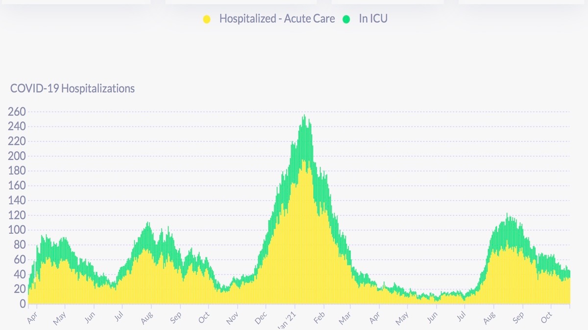 On Oct. 21, DPH reports there were 45 covid hospitalizations,Ā or aboutĀ 5.1 per 100,000 (based on an 874,000 population). Only 10 of those were in ICU. DPH has not reported breakthrough hospitalizations and deaths since Sept. 17.Ā According to the CDC, there were 38 new admissions for the seven days ending Oct. 22Ā (-11.63 percent from the previous seven days). For the week ending Oct. 22, covid patients accounted for 2.58Ā percentĀ of hospital beds (no change from the previous week) andĀ 5.01 percentĀ of ICU beds (-1.38 percent from the previous week).Ā Ā As of Oct. 18, the CDC says that, of more than 189 million vaccinated U.S. residents, 41,127 patients with a covid vaccine breakthrough infection were hospitalized or died (though 26 percent were either aymptomatic or not covid related). Note: 85 percent of the deaths and 66 percent of the non-fatal hospitalizations were among those 65 and older.