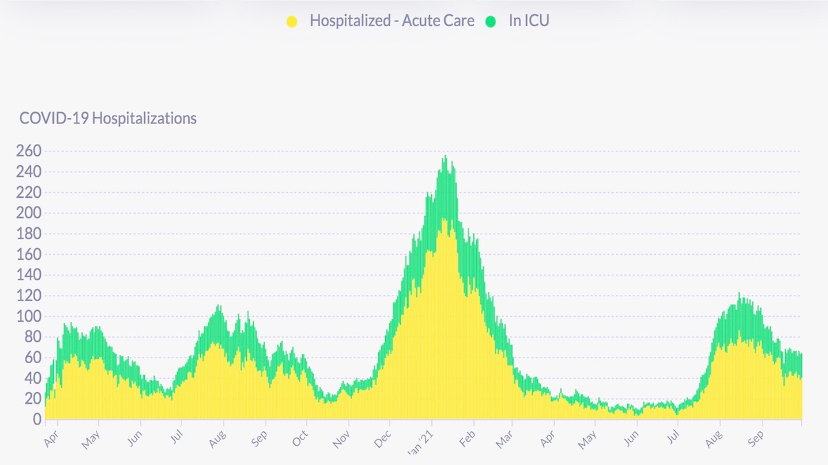 Are hospitalizations “decoupled” from cases? Since peaking in mid-August, Delta hospitalizations have fallen about 48 percent but have been fluctuating in the 60s for the past two weeks.Ā On Sept. 30, DPH reports there were 64 covid hospitalizations,Ā or aboutĀ 7.3 per 100,000 (based on an 874,000 population). The ICU population remains, as it has been since Sept. 16 between 20 and 26. DPH has not provided information on vaccinated hospitalizations recently. The latest update says 77 fully vaccinated San Franciscans have been hospitalized (a rate of 12.6 per 1,000 cases, compared to 85.1 per 1,000 cases for those not fully vaccinated). According to the CDC, there were 48 new admissions for the week ending Oct. 1Ā (up 4.35 percent from the previous week). For the week ending Oct. 1, covid patients accounted for 3.48 percent of hospital beds (no change from the previous week) and 8.63 percent of ICU beds (no changeĀ from the previous week). As of Sept. 27, the CDC says that, of more than 183 million vaccinated U.S. residents, 22,115 patients with a covid vaccine breakthrough infection were hospitalized or died (though 17 percent of deathsĀ and 18 percent of hospitalizations did not have symptoms of covid, or their hospitalization or death was not covid-related).Ā