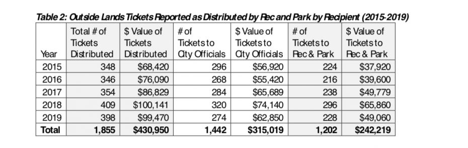 Clearly, though, the king of ticket dissemination is the Recreation and Park Department, with much of that coming from the Outside Lands festival. The department has reported it distributed 1,855 Outside Lands tickets between 2015 and 2019 alone, with a value of $431,000.