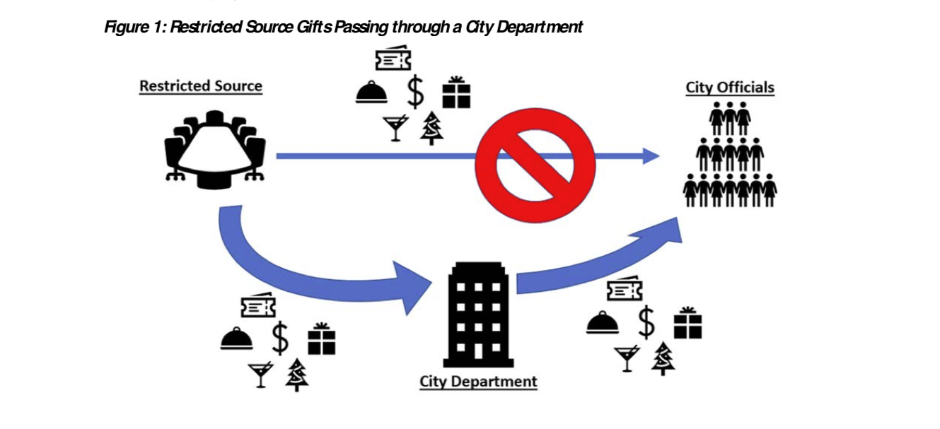 At the heart of this ethics report is an examination of the ways around the city’s “restricted source rule.” This policy prevents city officers or employees from directly accepting gifts from an individual or group that has a contract with their department or has recently sought to influence them. But this rule can be sidestepped by presenting tickets or money for a party to a department, which is then disseminated to its intended recipients — and inducing much the same result.