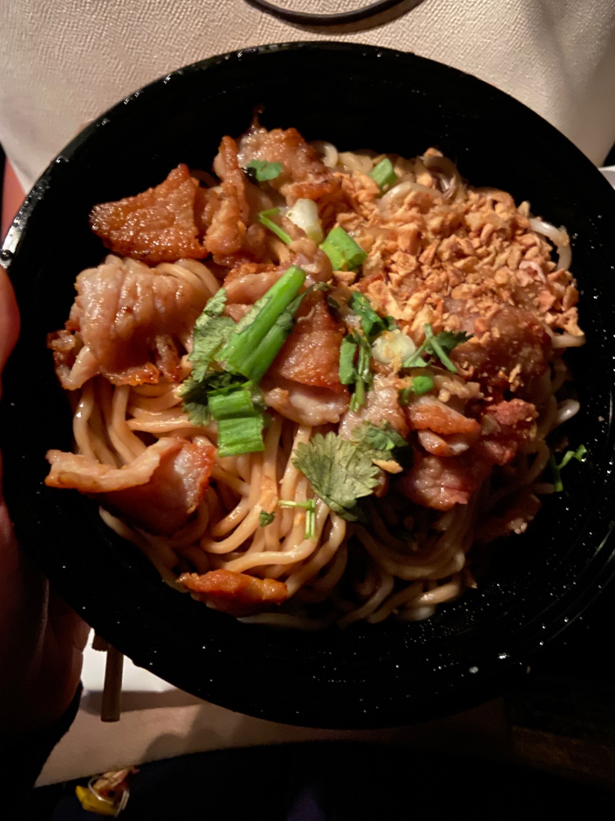 Contrary to your opinion, I found each noodle exquisitely coated in oil and swimming in fried brown garlic, resulting in delectable, flavorful bites. The pork was tender and well-seasoned — maybe a bit salty for the average eater, but exactly suited for my palate. The noodles were so hot, it fogged up my takeout box’s lid. The meal thawed my bones, and soothed my spirit.