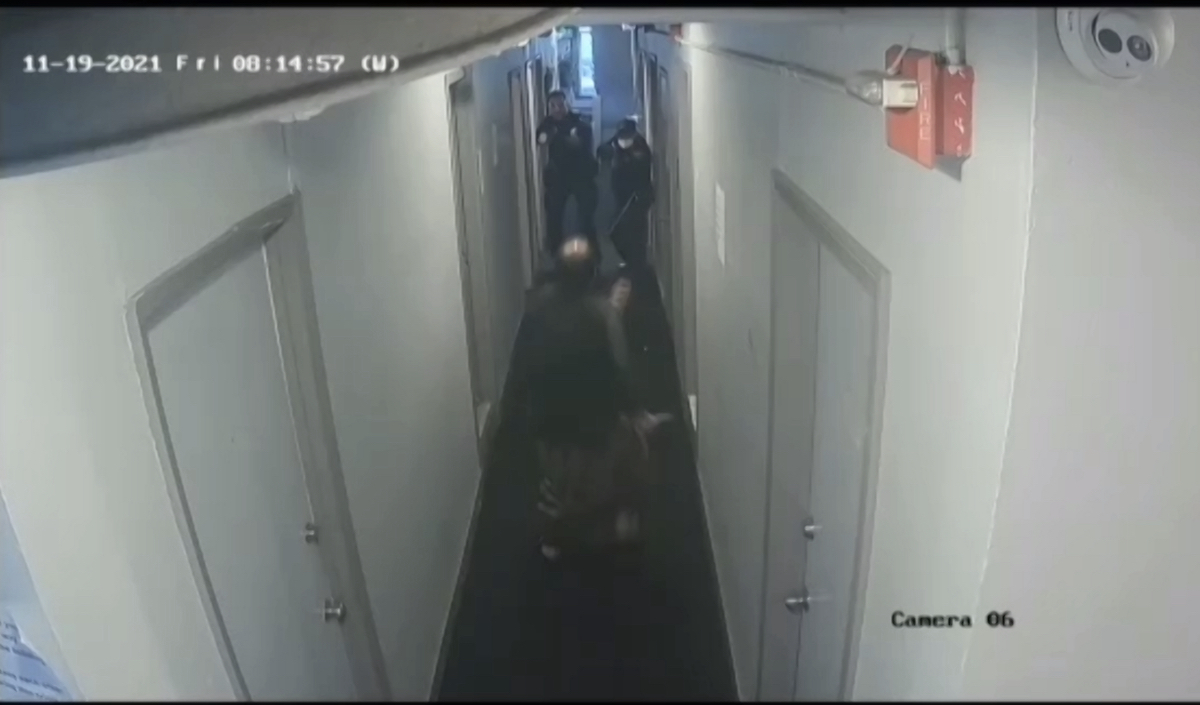 Hotel surveillance footage, which was presented to the public on Wednesday afternoon during the town hall meeting, showed Amani walking the halls with a knife and speaking in an agitated manner with two hotel employees. The employees held up broomsticks when he approached, as if to maintain their distance. One of them called 911 for assistance.