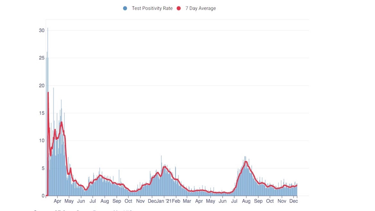 On Dec. 7, the 7-day average of daily new cases in the City remained at 79 or approximately 9 new cases per day per 100,000 residents (based on an 874,000 population). The 7-day average case rate among vaccinated (not boosted) residents was 7.7 per 100,000 vaccinated residents and for unvaccinated residents, 18.3 per 100,000 unvaccinated residents.