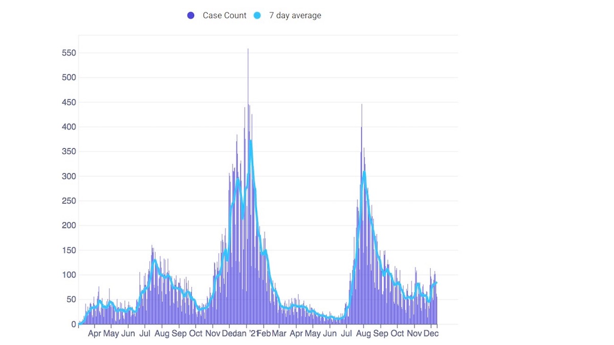 On Dec. 9, the 7-day average of daily new cases in the City was 82 or approximately 9.4 new cases per day per 100,000 residents (based on an 874,000 population). The 7-day average case rate among vaccinated (not boosted) residents was 8.2 per 100,000 vaccinated residents and for unvaccinated residents, 18.5 per 100,000 unvaccinated residents.
