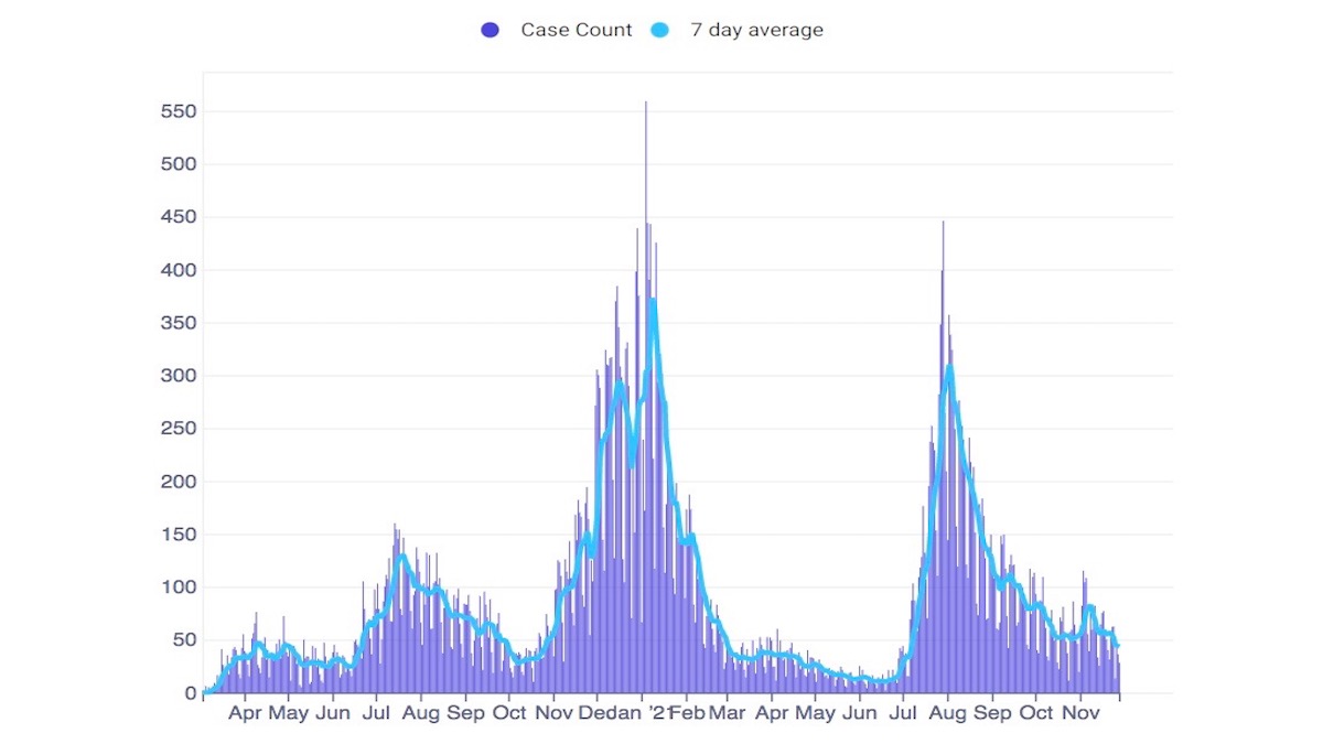On Nov. 25, the 7-day average of daily new cases in the City fell to 45, or approximately 5.1 new cases per day per 100,000 residents (based on an 874,000 population), the first time under 50 since July 7. This may be an artifact of Thanksgiving reporting, or lack thereof. The 7-day average case rate among vaccinated (not boosted) residents was 4.2 per 100,000 vaccinated residents and for unvaccinated residents, 10.2 per 100,000 unvaccinated residents.