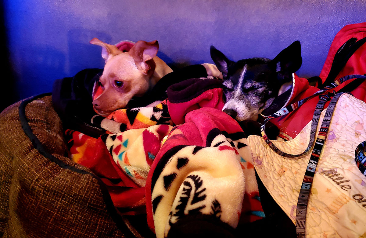 Ha, ha! Pups slipped past kitty doorman and got good and comfy!
