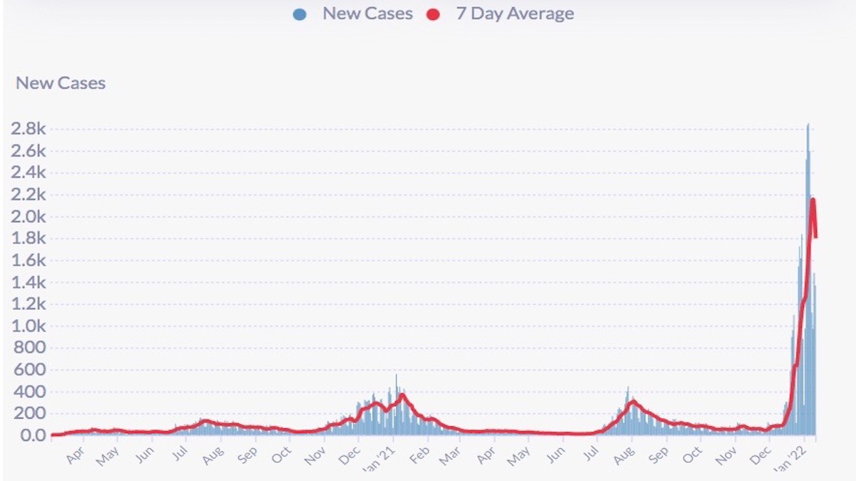 Again, DPH has revised its numbers. The number here represents the lowest since Jan, 5. On Jan. 11, the 7-day average of daily new infections recorded in the City was 1797 or approximately 205.3 new infections per day per 100,000 residents (based on an 874,000 population). Revised numbers show the peak at 2155 recorded on Jan. 9. According to DPH, the 7-day average infection rate among vaccinated residents on Jan. 11 was 185 per 100,000 vaccinated residents and for unvaccinated residents, 387 per 100,000 unvaccinated residents.