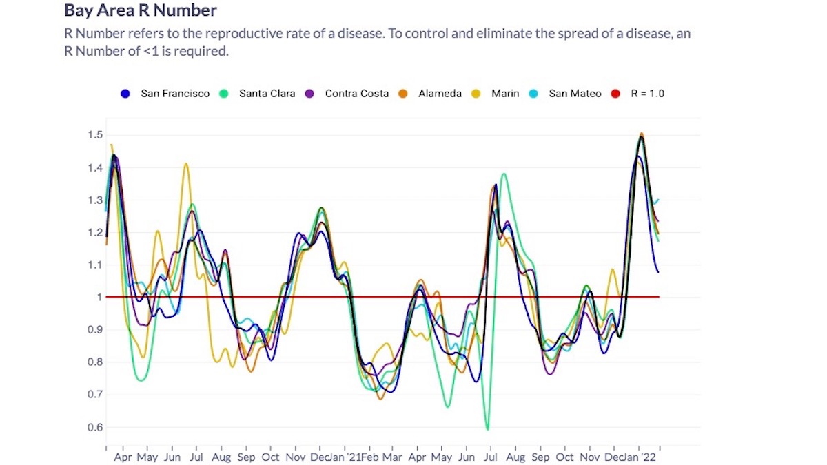 With omicron apparently in decline, R Number models show the San Francisco R Number close to or below 1. Hospitalizations, average infection numbers and positivity rates are coming down. Slowly.