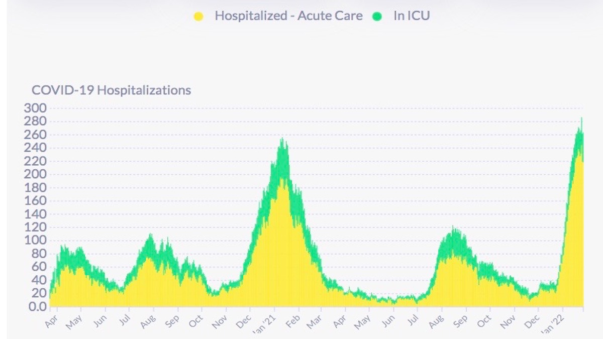 On Jan. 27, DPH reports there were 263 covid hospitalizations, or about 30.7 hospitalizations per 100,000 residents (based on an 874,000 population). Hospitalizations have been above 260 since Jan.18, hitting a high of 286 on Jan. 25. Today, the California Department of Public Health reports 258 covid patients in SF hospitals with 48 in ICU.