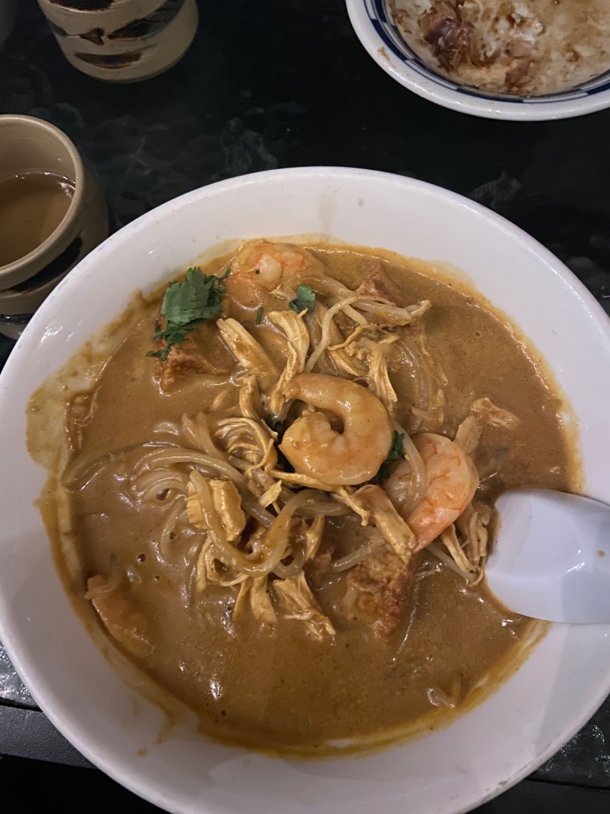 An attentive and friendly waiter served me laksa, a soup of coconut curry broth, tofu, bean sprouts, cilantro and rice noodles. As advertised, I was immediately hit with a potent curry taste and a spice that built. So, first type of spicy, check. The soup itself, to use more slang, was thick. Like, the kind necessitating three Qโs. I donโt even know if you could characterize it as broth.ย