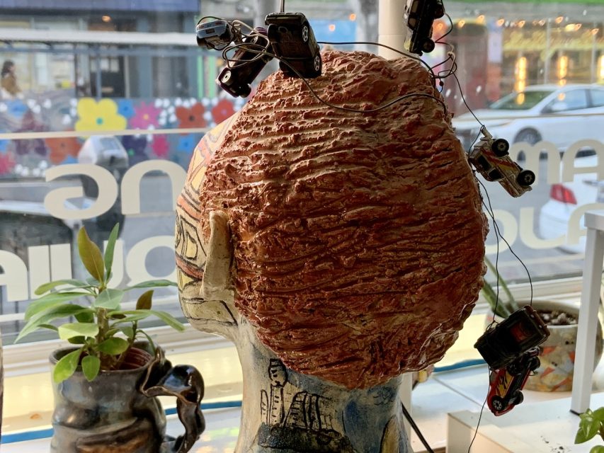 Tucked among the rest of her original and unexpected pottery is the bust of a woman with a crown of miniature cars. Lobel said it is “the goddess of parking” which her friend invented and named, with ample humor, “Asphalta.”