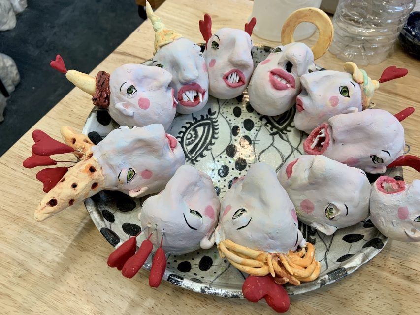 Lobel ultimately prefers working with clay (“it is what it is,” she says) and hand-builds her pieces versus using a pottery wheel. She typically makes what she calls “narrative sculptures.”