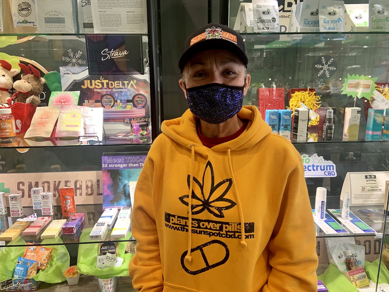 Nowadays, she works for her longtime neighbor and friend Reggie Wise, Sun Spot CBD’s founder/creator. They split duties: She takes on more of the personal and artistic details, like setting up product displays, and is at the counter on Tuesdays and Thursdays.