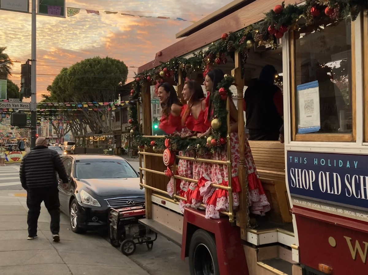 A trolley visits the Mission on Dec. 11, 2021 to promote local holiday shopping. Photo by Eleni Balakrishnan