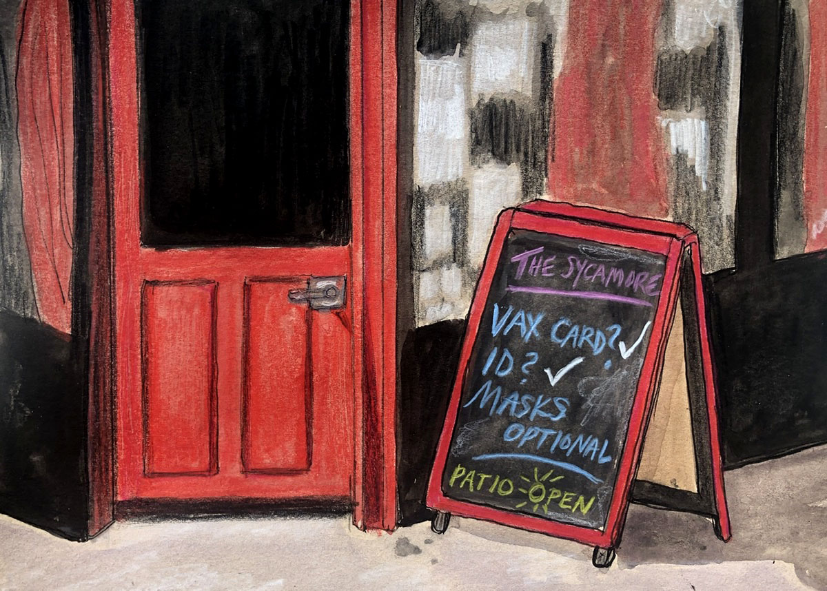 Even mostly empty, the Sycamore feels alive, which makes me feel a little more alive. I’d spent part of my afternoon downtown getting a Covid-19 test so that I could attend a big underground party on Saturday. Vaccines required, a negative PCR test within 48 hours required, and mask-wearing required during the entire event. Much stricter rules than going to a bar. I associate the Sycamore with some of those art parties, because it’s a bar where some of the people who throw those parties hang out. Or at least used to. Who knows, anymore?