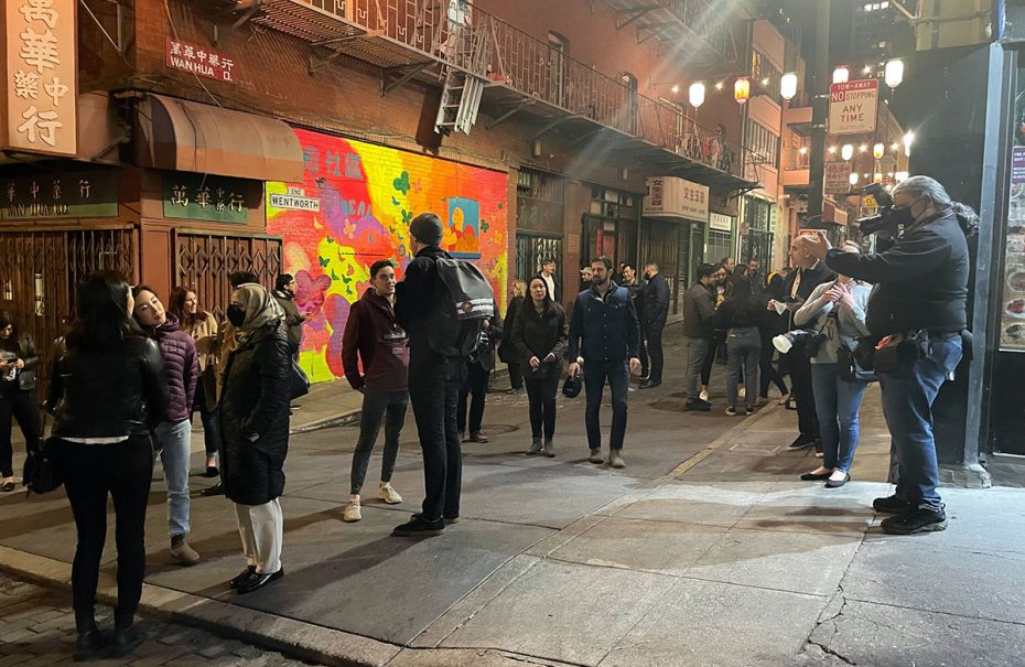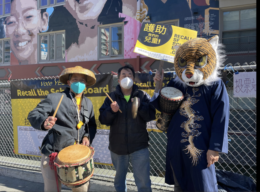 Around noon, Su hurriedly left the polling place and walked to a barbed wire fence on Stockton Street. Here, several Chinese activists in traditional clothing were playing drums. One wore a tiger head and a dark blue robe embroidered with a dragon in gold thread.