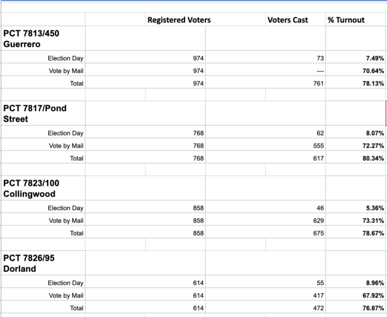 Like the rest of the city, most voter turnout in the September, 2021, election came through mail-in ballots, but those too are down, according to the Department of Elections. In September, Bethany Center had 58 in-person voters, compared to 561 mailed in. Cesar Chavez Elementary had 60 walk-ins and 493 mailed in, and Mission Arts Center on Treat Avenue had 45 walk-in voters in September and 433 mailed in. —Eleni Balakrishnan