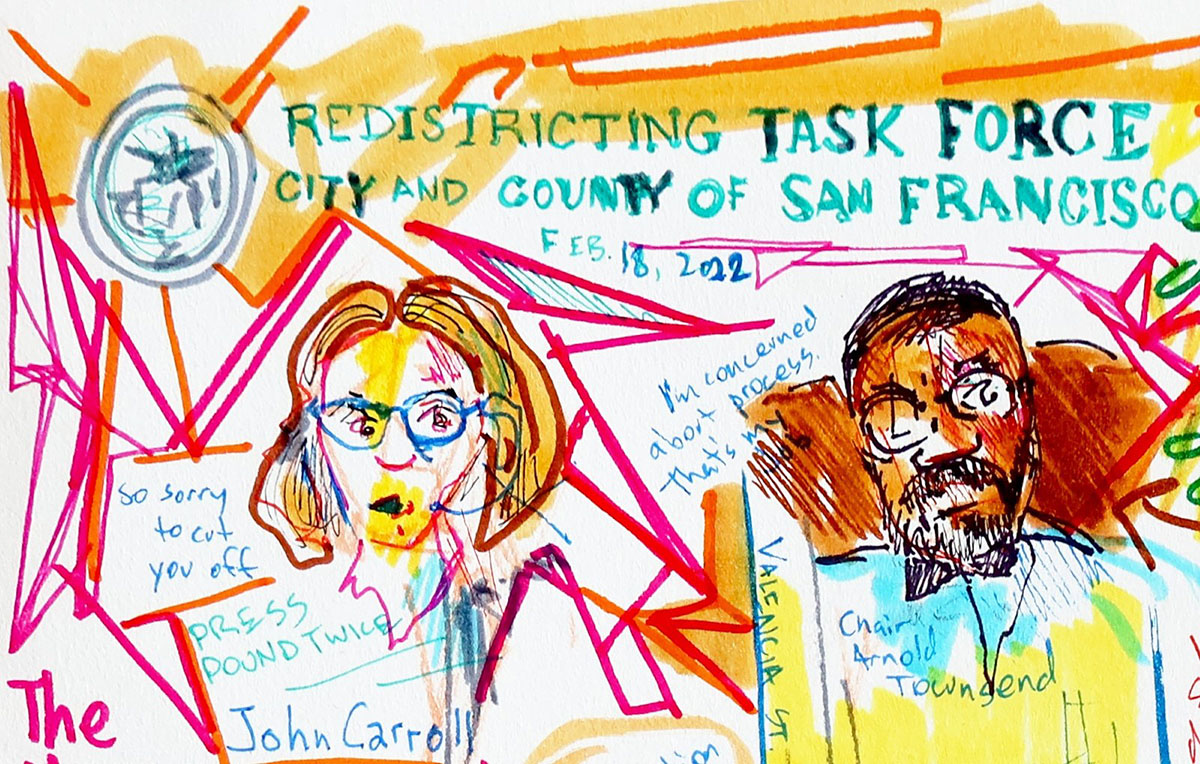 The Redistricting Task Force of the City and County of San Francisco is holding a series of public meetings to hear from constituents. The Feb. 18, 2022, meeting focused on District 9, so I attended and took sketch notes of the proceedings in realtime.