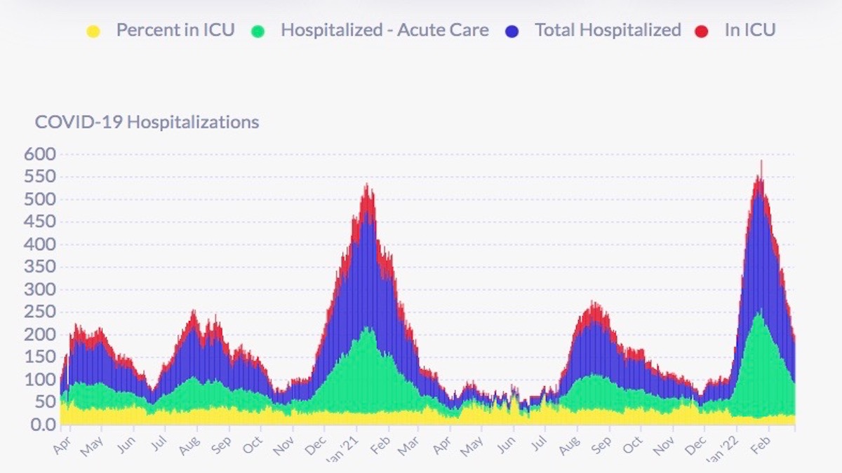 Over the past week, hospitalizations have dropped 28 percent. On Feb. 26, DPH reports there were 89 covid hospitalizations, or about 10.1 covid hospitalizations per 100,000 residents (based on an 874,000 population). ICU patients have dropped below 20 for the first time since Jan. 2. Today, the California Department of Public Health reports 87 covid patients in SF hospitals and 15 ICU patients. DPH has yet to figure out how many covid patients are vaxxed and how many unvaxxed.